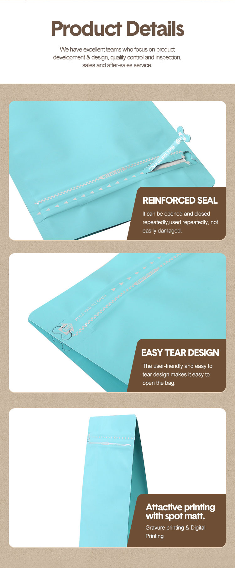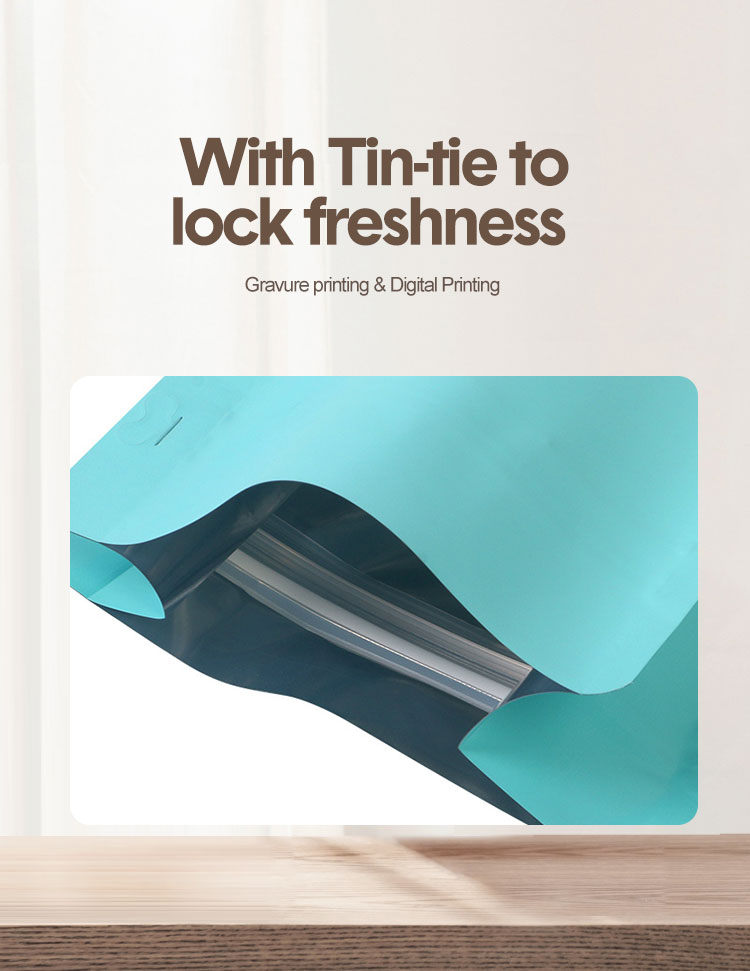 The closure options include Tin Tie, Slider Zipper, Pocket Zipper, or Velcro Zipper. Different structures can withstand 600–1200 opening cycles, with a zipper peel strength of approximately 30–38N, meeting the frequent use requirements of roasteries and retailers. The opening area is treated with a reinforced film layer, making it smoother for consumers to open, improving the product user experience.