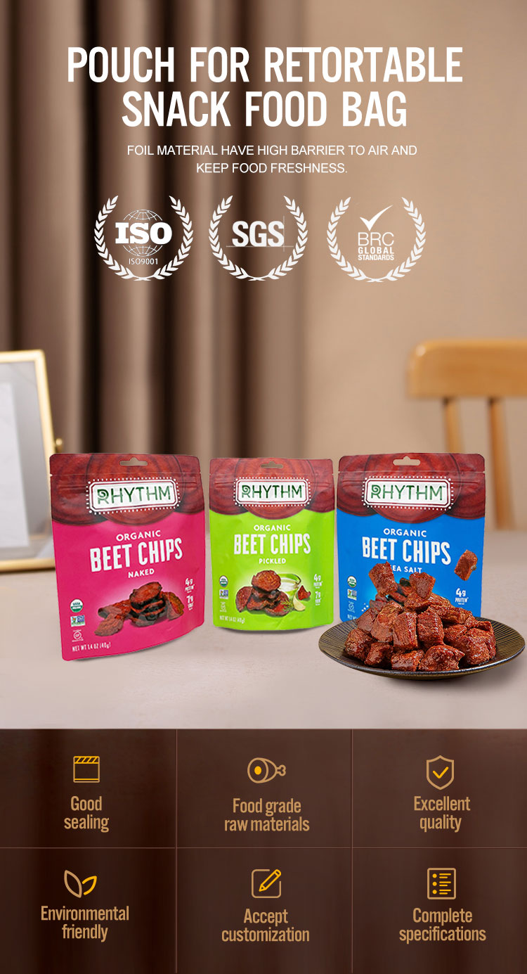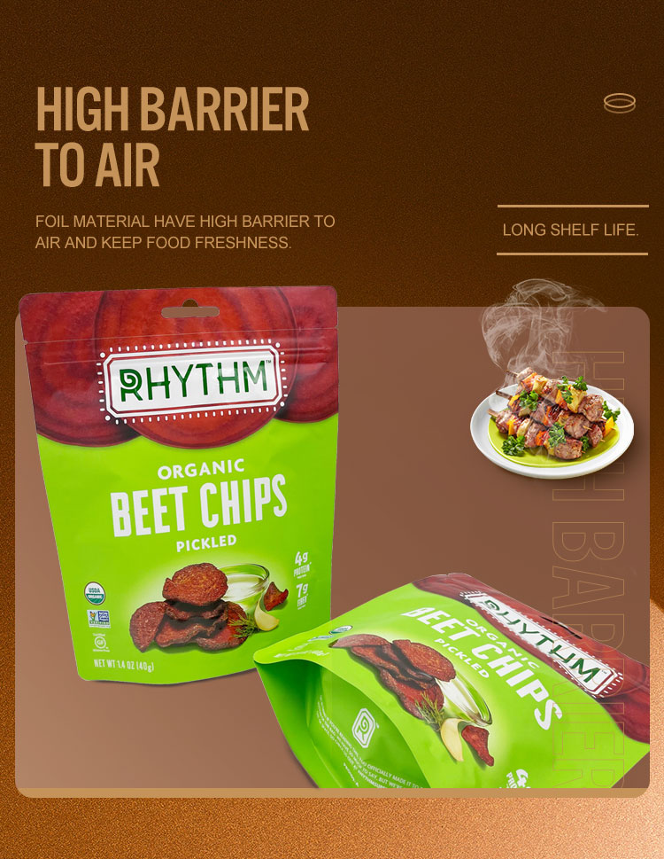 Based on PET/VMPET/PE and PET/AL/PE structural combinations, it effectively blocks oxygen and moisture. Oxygen permeability can be controlled within 1–5 cc/m²·day, and moisture permeability can be maintained within 1–3 g/m²·day. This meets the basic shelf-life requirements of snack products such as dry food, nuts, and seasoning powders, preserving the flavor, aroma, and dryness of the contents.