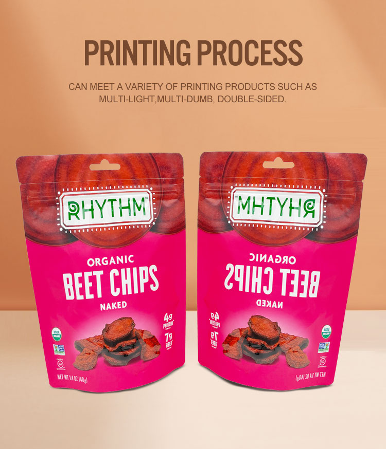 Recyclable Stand-Up Pouches offer diverse visual effects through various finishes, including glossy, matte, and paper-like textures. They support gravure printing and digital printing processes, achieving a printing precision of 150-200 lines per second. High-coverage graphics and text can be printed on three sides of the pouch, showcasing brand, flavor, and promotional elements within a limited space, enhancing shelf recognition and adapting to different snack packaging series design strategies.