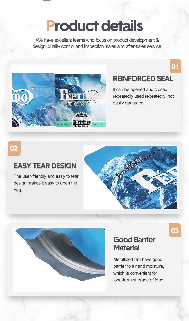 The 1.2kg Pet Food Aluminum Foil Flat Bottom Pouch is a specialized packaging solution designed for pet food. It features a flat bottom structure, which provides stability and makes it easy to stand upright on shelves or countertops. The aluminum foil material offers excellent barrier properties, effectively protecting the pet food from moisture, air, and light, thus ensuring its freshness and nutritional value over an extended period. This type of packaging is commonly used for various types of pet food, including dry kibble, wet food, and treats. It is convenient for pet owners to use and store, and the 1.2kg size is suitable for feeding pets with a moderate amount of food, ensuring that the pet food remains fresh until it is fully consumed.