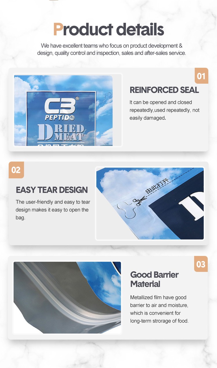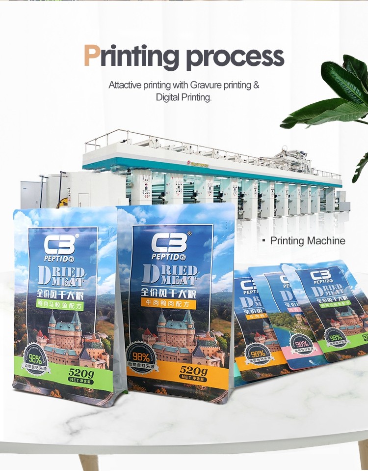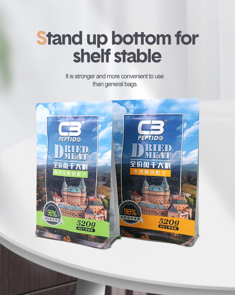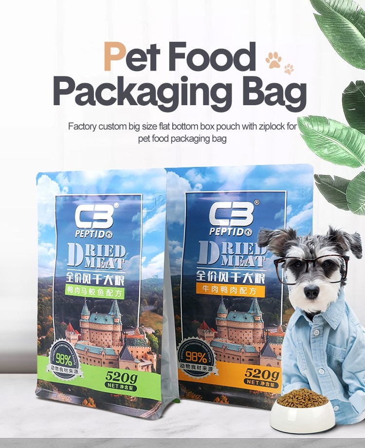 The Custom Dog Food Stand up Pouch with Ziplock is a specially designed packaging solution for dog food. It is a stand-up pouch that can stand upright on its own, making it convenient for storage and display. The ziplock feature ensures that the dog food inside the pouch can be sealed tightly, which helps to keep the food fresh for a longer period of time by preventing air and moisture from entering. This type of packaging is usually made from high-quality materials that are safe for food contact. It can be customized in terms of size, shape, and design to meet the specific needs of different dog food brands. The pouch may feature colorful and attractive graphics, such as images of dogs or dog food ingredients, as well as important information like the brand name, product description, and nutritional details. It is an ideal packaging choice for dog food producers who want to offer a convenient and visually appealing way to package and sell their products.