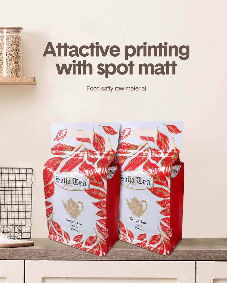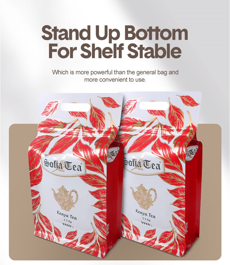 The Flat Bottom Stand Up Zipper Tea Pouch is a convenient and practical packaging solution for tea products. It features a flat bottom design that allows the pouch to stand upright on its own, making it easy to store and display on shelves. The zipper closure ensures that the tea inside remains fresh and protected from air and moisture. This type of packaging is not only visually appealing but also durable and user - friendly. It is perfect for a variety of tea products, such as loose leaf tea, tea bags, and herbal tea, helping to keep the aroma and flavor of the tea intact while providing an easy - to - use packaging option for consumers.