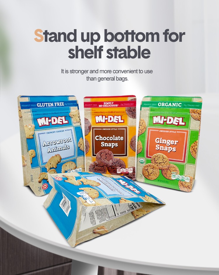 The Side Gusset Stand Up Cookies Packaging Pouch is a specialized packaging solution designed for cookies. It features a stand - up base, which allows the pouch to stand upright on shelves or countertops, making it more stable and visually appealing. The side gussets provide additional space inside the pouch, enabling it to hold a generous amount of cookies without crushing them. This type of packaging is typically made from high - quality, food - safe materials that can protect the cookies from moisture, air, and external contaminants. It often includes a resealable zipper, allowing consumers to easily close the pouch after opening it to keep the cookies fresh for a longer period. The pouch can be customized with attractive graphics and branding, making it a great choice for both commercial packaging and gifting purposes.