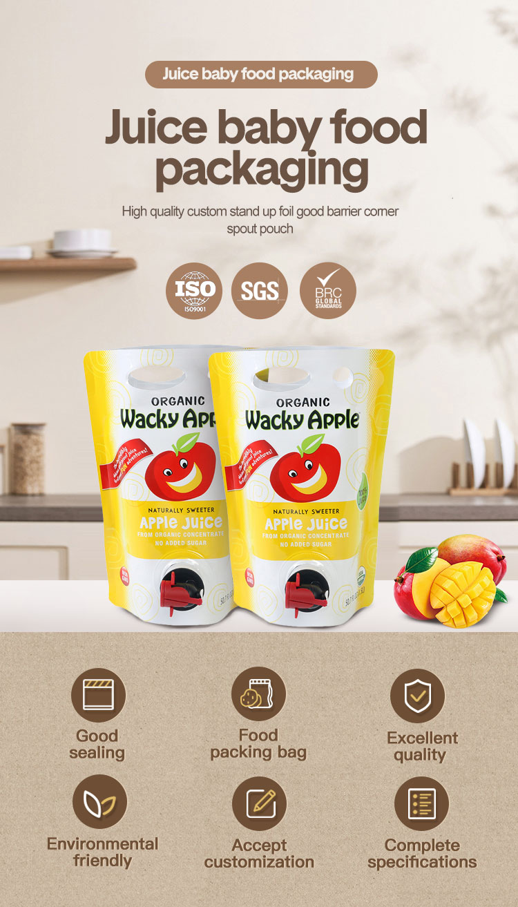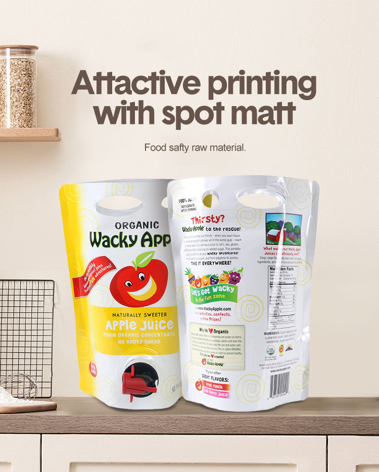 The Stand Up Flat Bottom Spout Pouch with Valve is a versatile packaging solution designed for a wide range of products. This package features an attractive printing with spot matt finish, which not only enhances the visual appeal but also adds a premium touch. The high barrier properties effectively block air, ensuring the freshness and longevity of the food products inside. The stand-up flat bottom design allows the pouch to stand upright on shelves, making it stable and easy to display. The spout provides convenient pouring, while the valve helps maintain the freshness by allowing air to escape without letting it back in. This packaging is perfect for products like snacks, beverages, and other food items that require both protection and easy access.