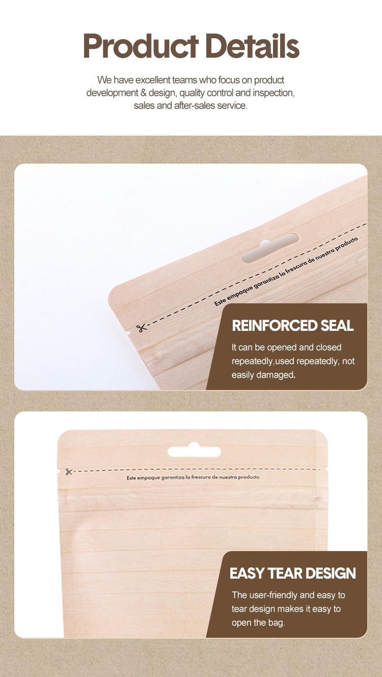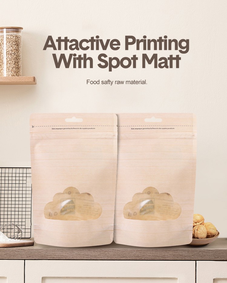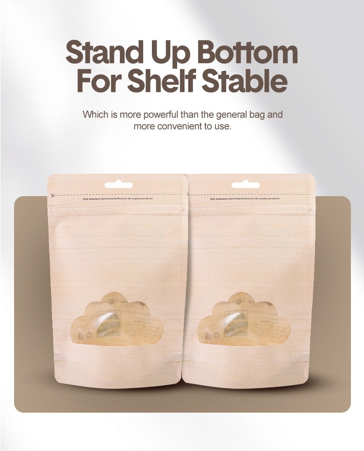 This is a Kraft paper pouch designed for food packaging. It features a clear window that allows the contents to be easily seen, making it convenient for customers to identify the product inside. The reinforced seal ensures that the bag can be opened and closed repeatedly without being easily damaged, which enhances its reusability. Additionally, the easy tear design makes it user-friendly and convenient to open. The stand-up bottom provides stability when placed on shelves, making it more powerful and convenient to use compared to ordinary bags.