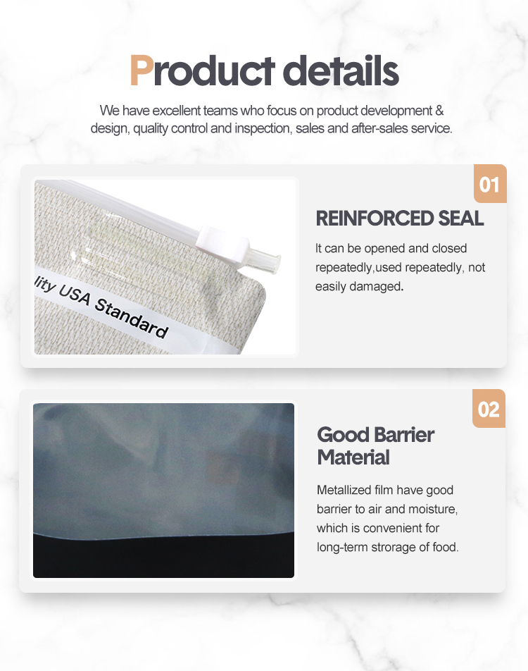 Our company offers a variety of value-added features to enhance the functionality and appeal of our packaging solutions. These include Aplix Velcro Zipper for easy open and reseal, Top Slider Zipper for convenient access, Pocket Zipper for added convenience, Hot Stamping Foil for decorative and branding purposes, Custom Shaped Window to showcase the product inside, Laser Scoring for easy tearing, One Pouch One Product code for traceability, Plastic Handle for easy carrying, and Tin tie for better sealing. These features are designed to meet diverse customer needs and add extra convenience and attractiveness to the packaging.