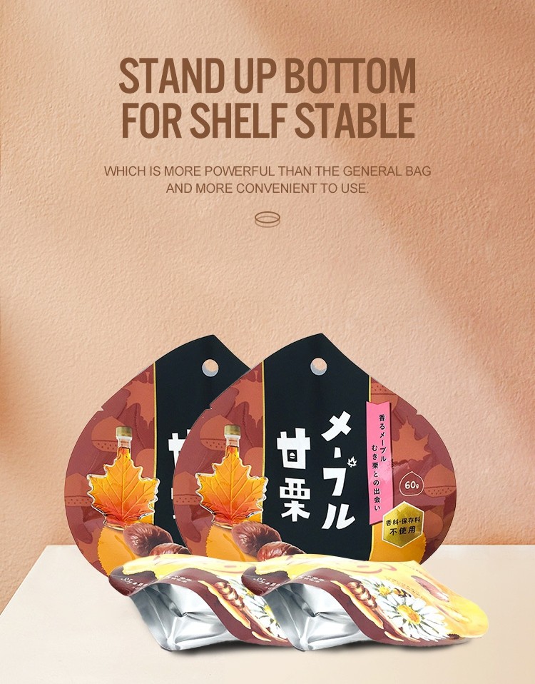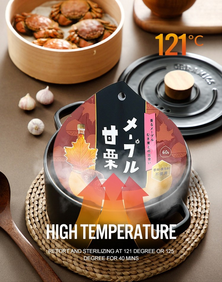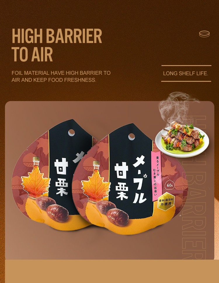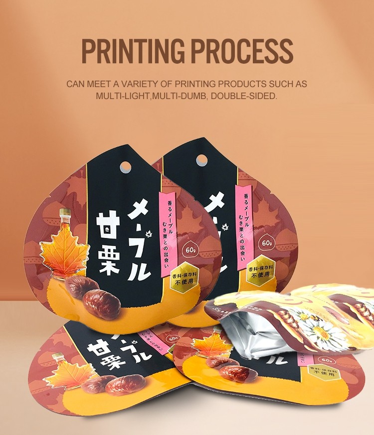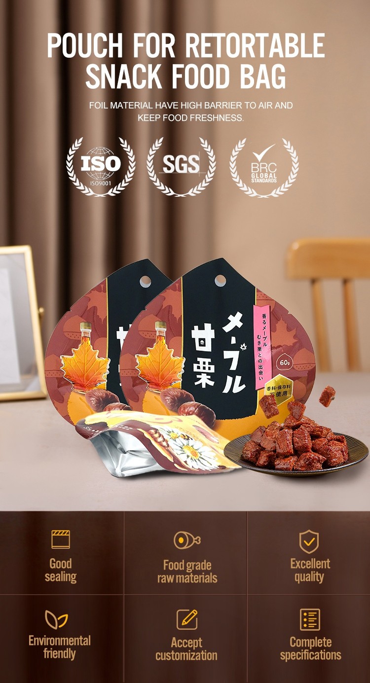 The Custom Shaped Snack Package Retort Pouch is a specialized packaging solution designed for snacks. It features a regular zipper, allowing for easy opening and resealing to maintain freshness. The bag style can be either a flat pouch or a stand-up pouch, offering versatility in design and presentation. This retort pouch is highly food-safe and can withstand retort sterilization at temperatures ranging from 121 to 135 degrees Celsius without bursting or leaking. This process helps preserve the original flavor of the snacks while significantly extending their shelf life. It is an ideal packaging choice for a variety of snacks, combining convenience, safety, and long-term preservation.