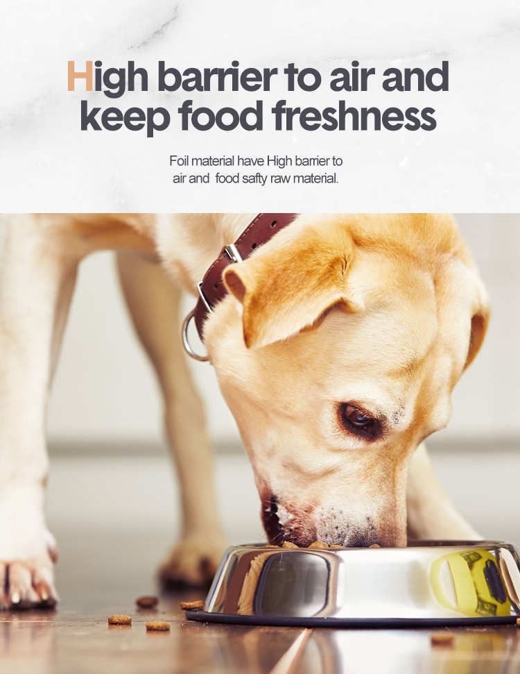 Bag body materials can be selected from structures such as PET/PE, PET/NY/PE, PET/NY/White PE, PET/VMPET/PE, or OPP/VMPET/PE. Different material combinations have varying emphasis on barrier properties. Common total thickness is controlled between 90μm and 130μm. The NY layer helps enhance puncture resistance. The VMPET layer reduces water vapor transmission rate. The materials meet standard food packaging requirements. Custom Dog Food Bags offer flexible material options to suit various types of dog food.