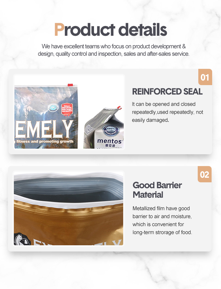 The bag surface can be chosen with a glossy or matte finish to enhance visual appeal. The white PE or aluminum-laminated structure helps improve printing clarity. The self-standing structure ensures the packaging stands upright well on the shelf. The bag features clean lines and a more organized overall appearance. The material's rigidity supports stable packaging form. The information area is clearly laid out for easy reading. Custom Dog Food Bags strike a balance between display effectiveness and practicality, making them ideal for retail sales.